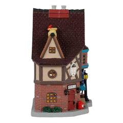 Wright & Sons Lamplighters from Lemax is a family run business that services these temperamental products. Located in one very interesting structure on Lumens Lane it has a three-staged roof plus is made from this mix of brick, wood and stucco. The building is all lit up inside but one of these lights in question remains off outside. A workman wearing brown and beige is about to climb his ladder, which is already correctly positioned, to check out the cause of this problem. Wright & Sons Lamplighters will certainly make you think about the olden days when these gas guzzlers were in use, whether you were there or not.